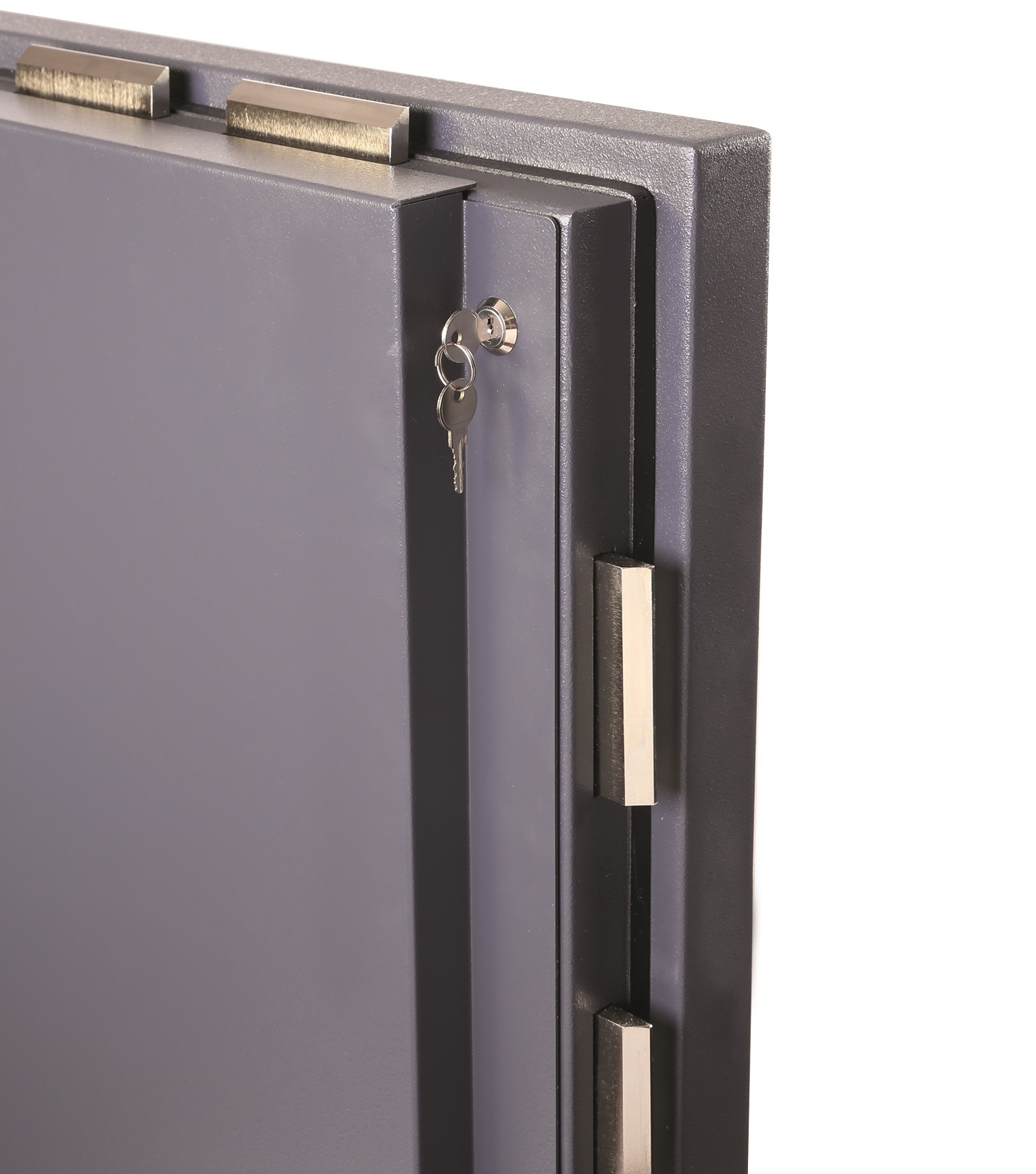 - Сейф HS3555E оборудуется четырёхсторонним ригельным механизмом, представленным десятью прямоугольными стальными ригелями 100×10 мм – выдвигающимися с трёх сторон, а также пассивными (неподвижными) со стороны петель.