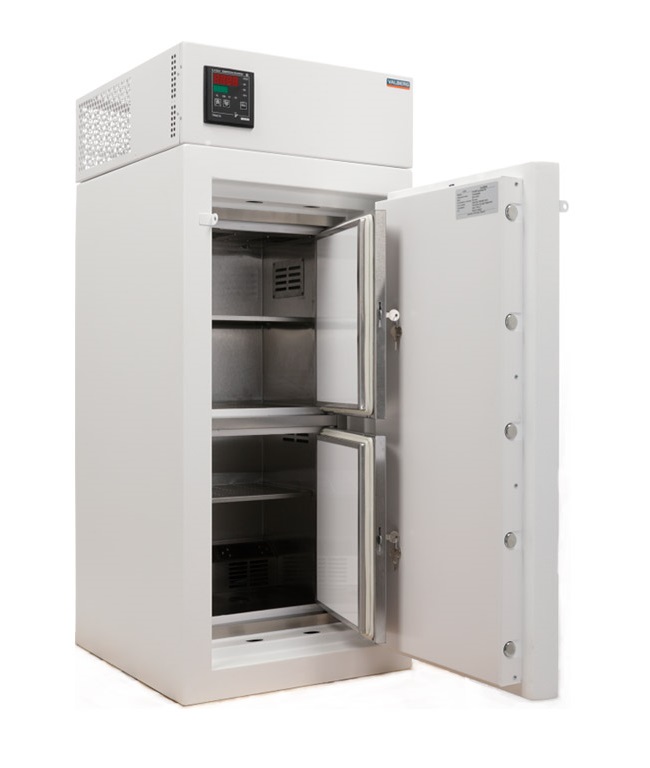 Рабочая камера сейфа холодильника Valberg TS-3/50 KL разделена на две части, выполнена из нержавеющей стали и оснащена отдельной дверцей.